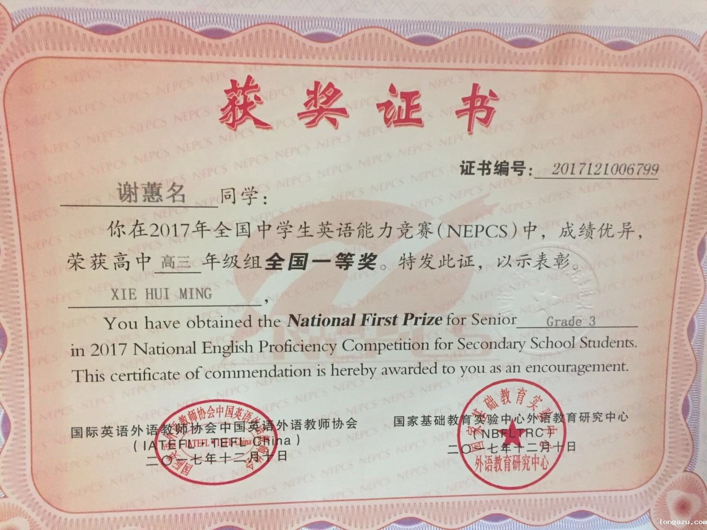 我校在2017年全国中学生英语能力竞赛中喜获佳绩