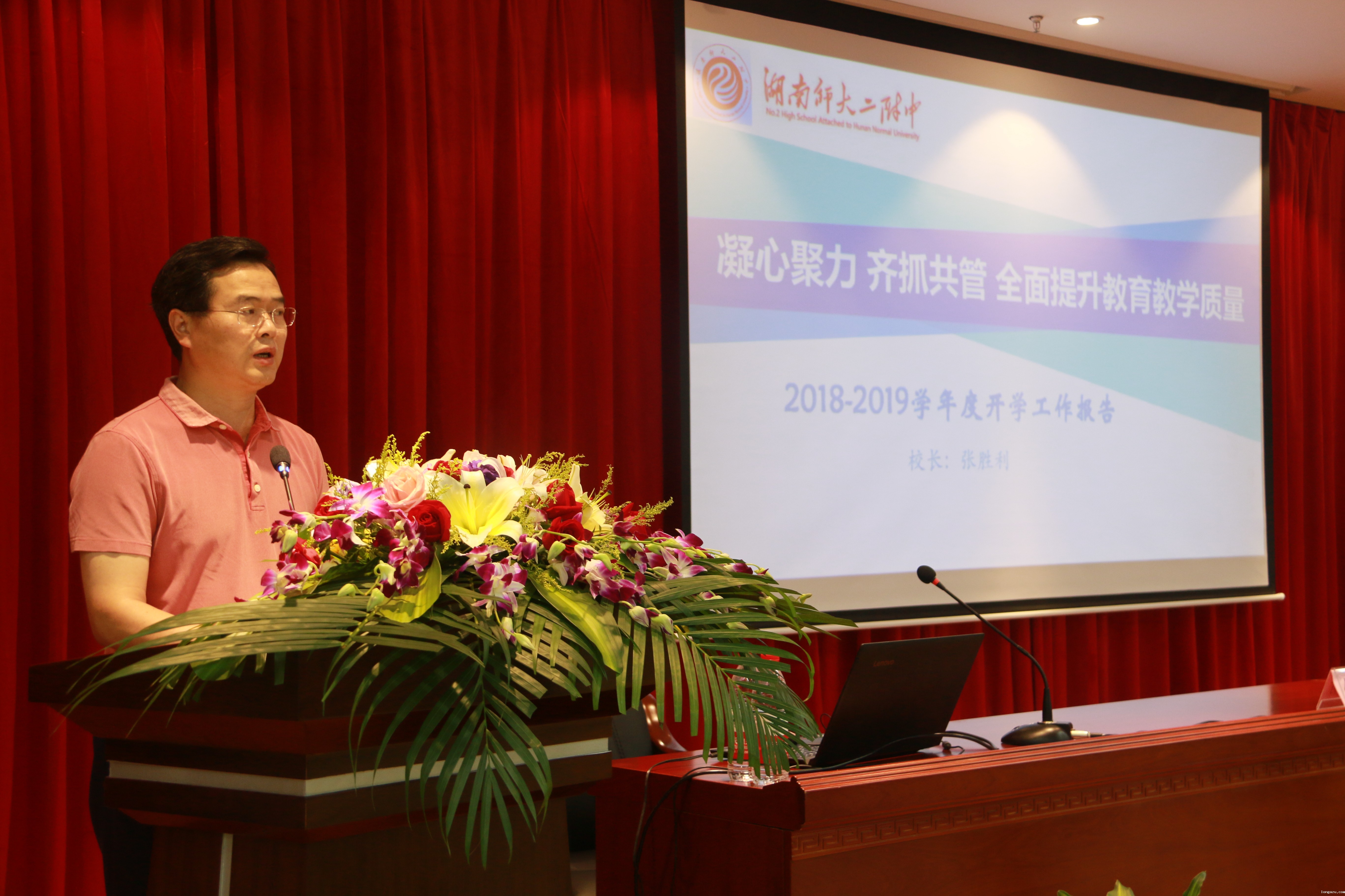 满怀喜悦的心情,带着美好的憧憬,我们又迎来了新的学年。2018年8月30日下午,湖南师大二附中全体教职工在格致楼新装成的多功能会议室相聚一堂,隆重召开新学年全体教职工大会。校长张胜利、校监张亚丽、副校长易鹏、副校长喻志军、党总支副书记兼教师发展处主任余柏青、校长助理兼工会主席李昌坤等校领导和行政人员出席大会。大会由校办主任杨锦宁主持。大会主题是回顾上学年工作,分析新学年的目标和任务,谋划、部署新学年的工作。会议在庄严的国歌和校歌声中拉开帷幕。会上,校长张胜利首先热情介绍了本学期新引进的20多名教师,并代表学校对新教师的加盟表示热烈欢迎。同时他宣布了新的领导班子成员任职名单。随后,他作了题为《凝心聚力,齐抓共管,全面提升教育教学质量》的工作报告。他在报告里回顾总结了上学年学校工作。他指出,在过去的一学年里,学校各方面工作紧紧围绕“两年完善展蓝图”的主旋律,审时度势、开拓创新,学校硬件逐步完善、学校特色初步显现、学校文化日趋成熟、师资力量日渐强大、学校影响日益提升,实现了学校跨越式发展。他代表学校满怀深情地向为学校发展付出努力和奉献的在职的或离职的教职员工致以崇高的敬意和衷心的感谢。